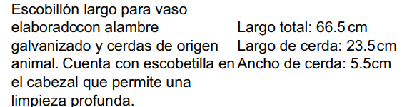 Escobillon largo para vaso elaborado con alambre galvanizado y cerdas de origen animal.