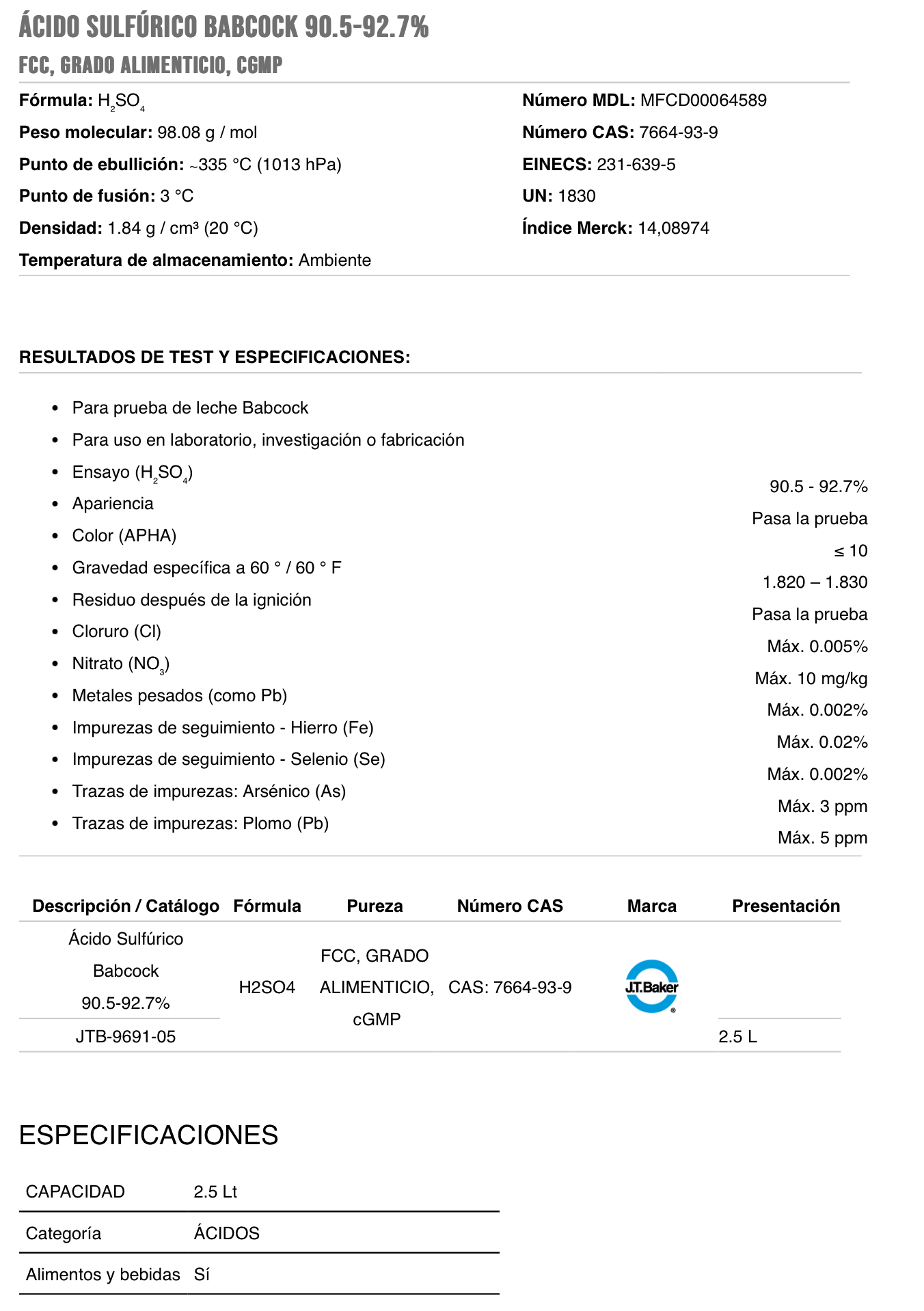ACIDO SULFURICO BABCOCK FCC, CGMP / 2.5 L PQE