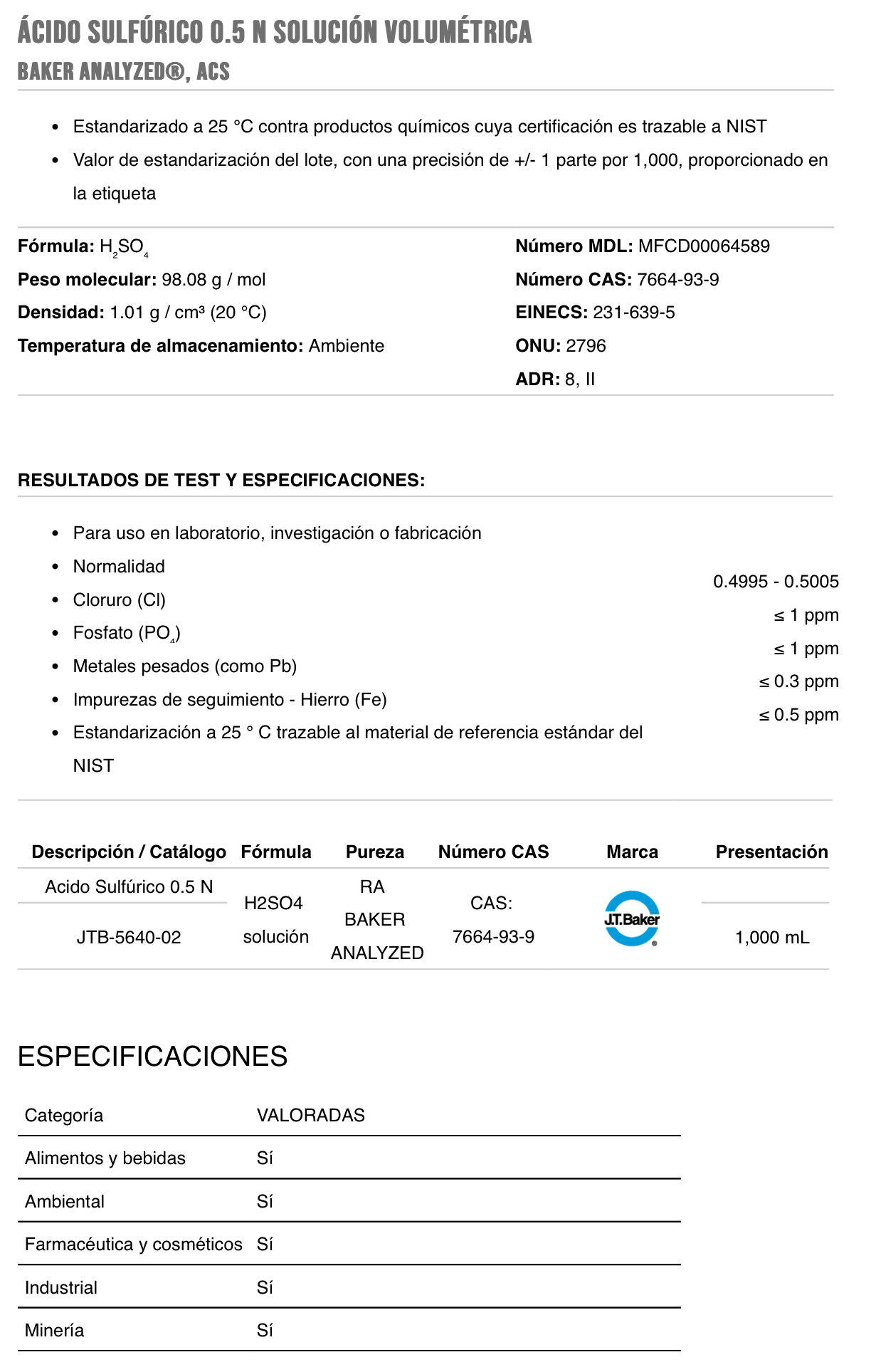Los reactivos y soluciones BAKER ANALYZED son un grado de sustancias químicas de alta calidad para uso industrial y en laboratorios especializados. Todas las etiquetas de reactivos BAKER ANALYZED brindan un análisis de lote que funge como garantía de pureza y consistencia. Los métodos analíticos utilizados para estas determinaciones se basan en procedimientos de prueba estándar descritos en publicaciones técnicas. La calidad de muchos de los reactivos BAKER ANALYZED cumplen o exceden los requisitos establecidos por la American Chemical Society (ACS). Estos productos son designados como reactivos BAKER ANALYZED ACS.