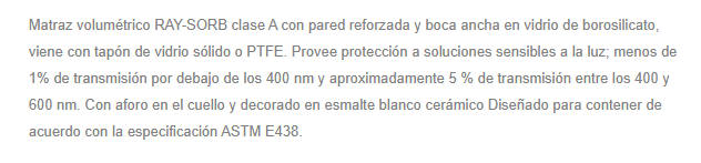 Matraz volumétrico RAY-SORB clase A con pared reforzada y boca ancha en vidrio de borosilicato, viene con tapón de vidrio sólido o PTFE. Provee protección a soluciones sensibles a la luz; menos de 1% de transmisión por debajo de los 400 nm y aproximadamente 5 % de transmisión entre los 400 y 600 nm.