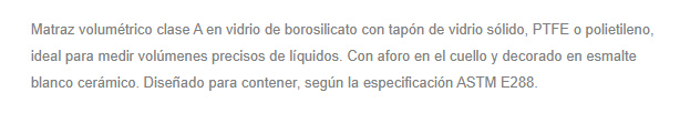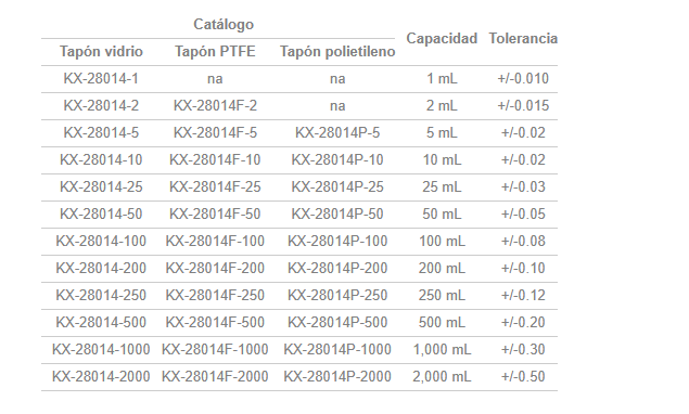 Matraz volumétrico clase A en vidrio de borosilicato con tapón de vidrio sólido, PTFE o polietileno, ideal para medir volúmenes precisos de líquidos. Con aforo en el cuello y decorado en esmalte blanco cerámico. Diseñado para contener, según la especificación ASTM E288. Catálogo Capacidad