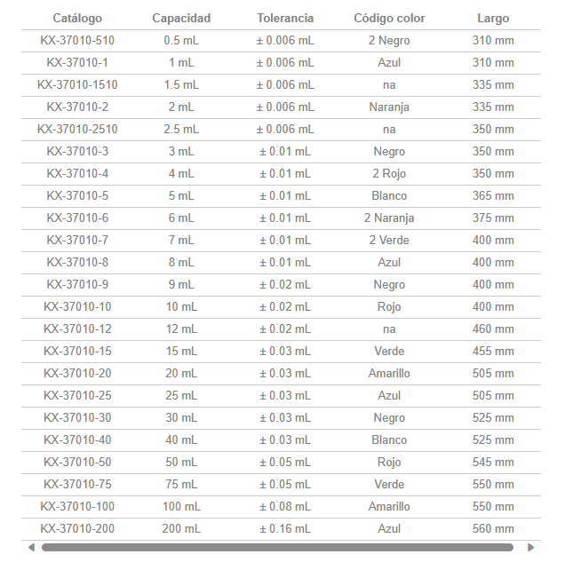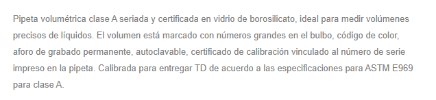 Pipeta volumétrica clase A seriada y certificada en vidrio de borosilicato, ideal para medir volúmenes precisos de líquidos. El volumen está marcado con números grandes en el bulbo, código de color, aforo de grabado permanente, autoclavable, certificado de calibración vinculado al número de serie impreso en la pipeta. Calibrada para entregar TD de acuerdo a las especificaciones para ASTM E969 para clase A.
