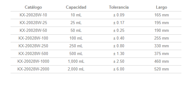 Probeta clase A en vidrio de borosilicato para entregar TD de doble escala. Tiene base hexagonal; para mayor estabilidad, escala normal e invertida y bumper de seguridad. Calibrada para entregar según las especificaciones de ASTM E1272 estilo I para clase A. Catálogo Capacidad Tolerancia Largo