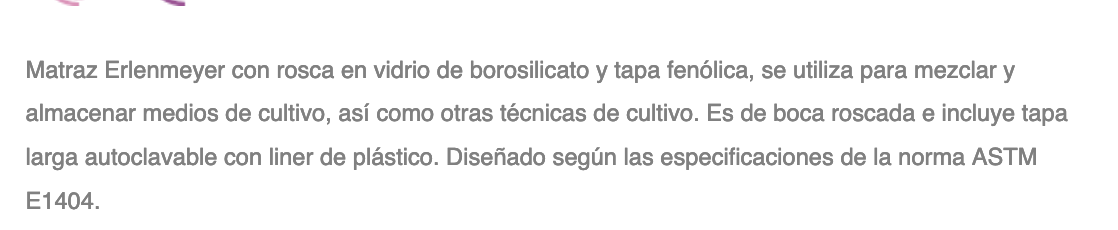 Matraz Erlenmeyer con rosca en vidrio de borosilicato y tapa fenólica, se utiliza para mezclar y almacenar medios de cultivo, así como otras técnicas de cultivo. Es de boca roscada e incluye tapa larga autoclavable con liner de plástico. Diseñado según las especificaciones de la norma ASTM E1404