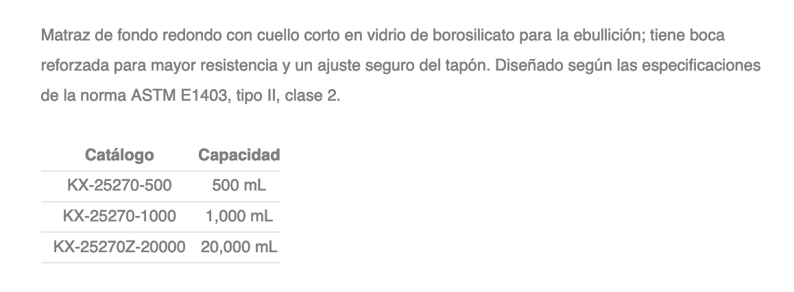 Matraz de fondo redondo con cuello corto en vidrio de borosilicato para la ebullición; tiene boca reforzada para mayor resistencia y un ajuste seguro del tapón. Diseñado según las especificaciones de la norma ASTM E1403, tipo II, clase 2. Catálogo Capacidad KX-25270-500 500 mL KX-25270-1000 1,000