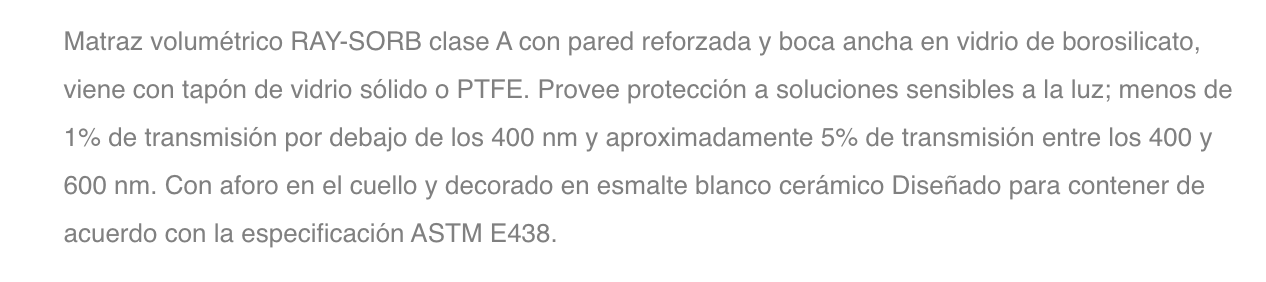 Matraz volumétrico RAY-SORB clase A con pared reforzada y boca ancha en vidrio de borosilicato, viene con tapón de vidrio sólido o PTFE. Provee protección a soluciones sensibles a la luz; menos de 1% de transmisión por debajo de los 400 nm y aproximadamente 5% de transmisión entre los 400 y 600 nm.
