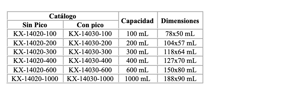 Vaso de precipitado Berzelius de forma alta en vidrio de borosilicato, ofrece una excelente resistencia mecánica, durabilidad, resistencia al ataque químico y al choque térmico. Ideal para realizar titulaciones. Tiene una área de acabado mate duradero para marcar con lápiz ordinario. Escala de doble capacidad en esmalte blanco de fácil lectura para indicar el volumen aproximado. El 14030 en la parte superior viene con pico para verter y el 14020 viene sin pico; cumplen las especificaciones en ASTM,E960 tipo lll y tipo lV.