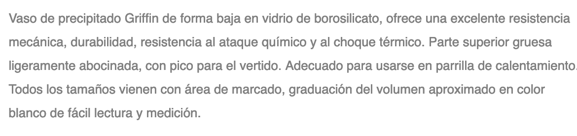 Vaso de precipitado Griffin de forma baja en vidrio de borosilicato, ofrece una excelente resistencia mecánica, durabilidad, resistencia al ataque químico y al choque térmico. Parte superior gruesa ligeramente abocinada, con pico para el vertido. Adecuado para usarse en parrilla de calentamiento.