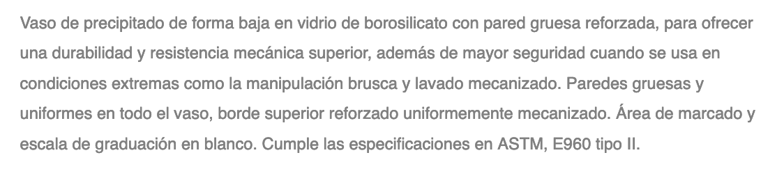 Vaso de precipitado de forma baja en vidrio de borosilicato con pared gruesa reforzada, para ofrecer una durabilidad y resistencia mecánica superior, además de mayor seguridad cuando se usa en condiciones extremas como la manipulación brusca y lavado mecanizado. Paredes gruesas y uniformes en todo el vaso, borde superior reforzado uniformemente mecanizado. Área de marcado y escala de graduación en blanco. Cumple las especificaciones en ASTM, E960 tipo ll.
