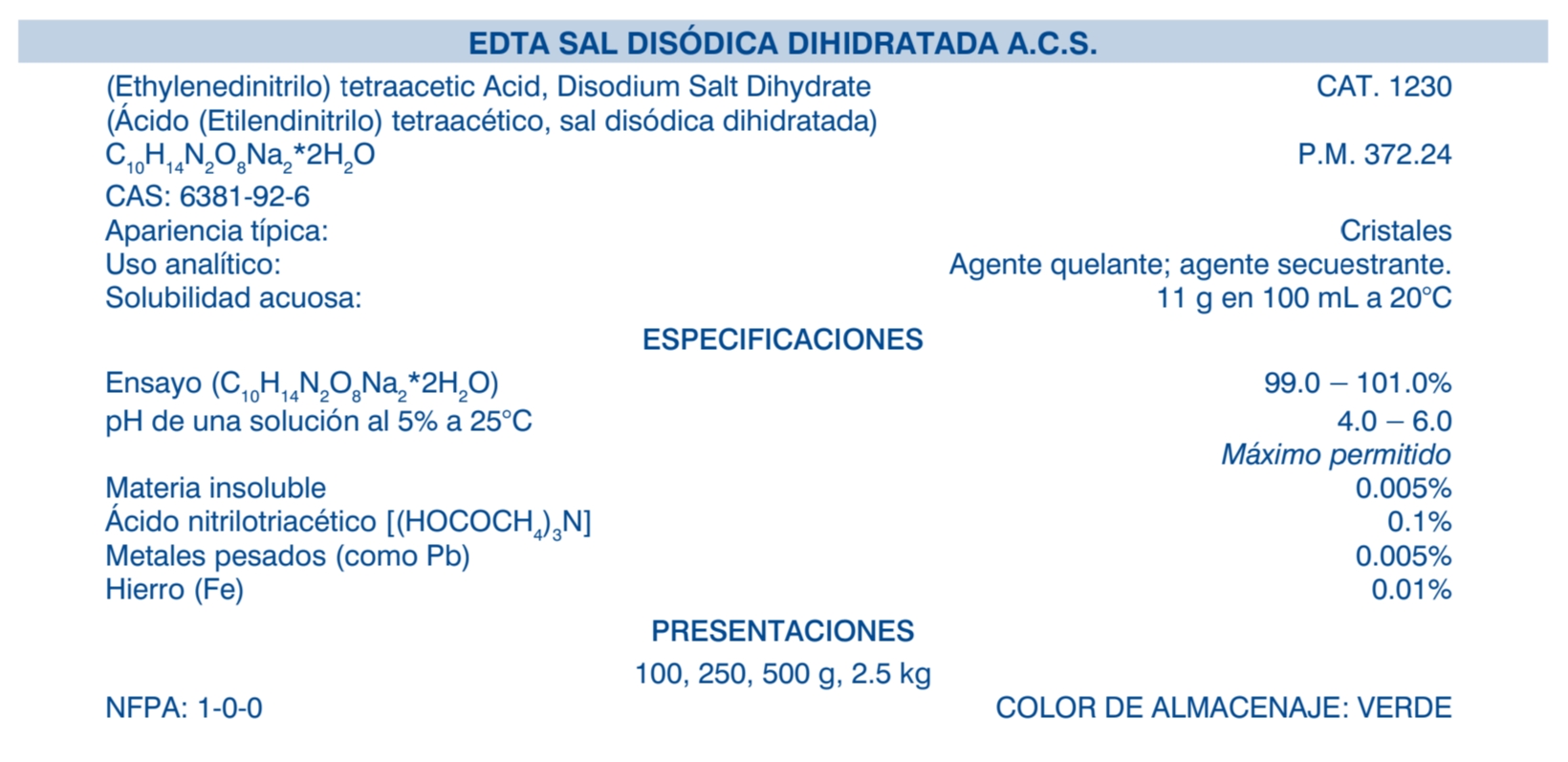 Grado de sustancias químicas de alta calidad para uso industrial y en laboratorios especializados. Todas las etiquetas brindan un análisis de lote que funge como garantía de pureza y consistencia. Los métodos analíticos utilizados para estas determinaciones se basan en procedimientos de prueba estándar descritos en publicaciones técnicas. La calidad de muchos de los reactivos cumple o excede los requisitos establecidos por la American Chemical Society (ACS).