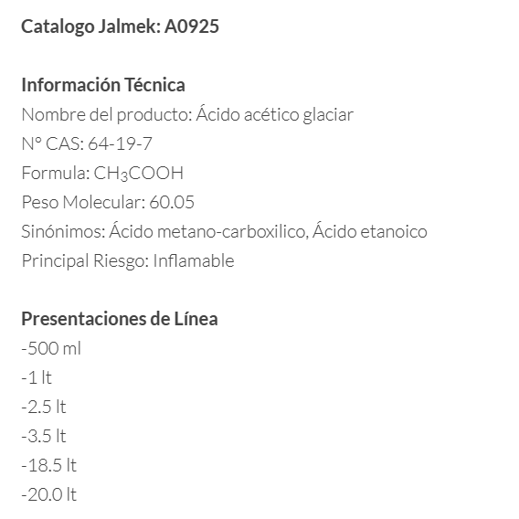 Grado de sustancias quimicas de alta calidad para uso industrial y en laboratorios especializados. Todas las etiquetas brindan un analisis de lote que funge como garantia de pureza y consistencia. Los metodos analiticos utilizados para estas determinaciones se basan en procedimientos de prueba estandar descritos en publicaciones tecnicas. La calidad de muchos de los reactivos cumple o excede los requisitos establecidos por la American Chemical Society (ACS).