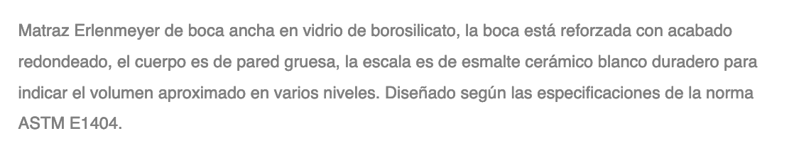 Matraz Erlenmeyer de boca ancha en vidrio de borosilicato, la boca está reforzada con acabado redondeado, el cuerpo es de pared gruesa, la escala es de esmalte cerámico blanco duradero para indicar el volumen aproximado en varios niveles. Diseñado según las especificaciones de la norma ASTM E1404.