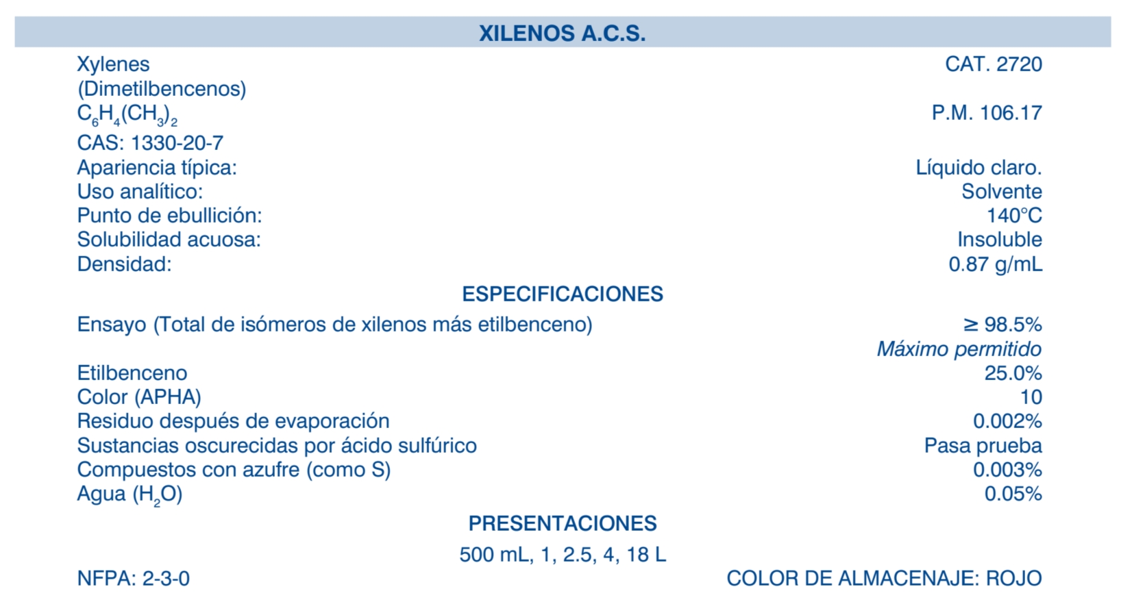 Grado de sustancias químicas de alta calidad para uso industrial y en laboratorios especializados. Todas las etiquetas brindan un análisis de lote que funge como garantía de pureza y consistencia. Los métodos analíticos utilizados para estas determinaciones se basan en procedimientos de prueba estándar descritos en publicaciones técnicas. La calidad de muchos de los reactivos cumple o excede los requisitos establecidos por la American Chemical Society (ACS).